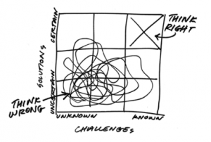 Business schools and training programs perpetuate outmoded thinking through the language, frameworks, tools, and techniques they teach. They focus on best practices, optimization, ROI, and metrics. They become the standards by which we are expected to measure pretty much everything. When we know the problem and are certain of the solution, the Think Right Practices are incredibly valuable. When we don’t know how well we understand the problem and how certain we are about the solution, when we navigate in the uncertain and the unknown, the Think Wrong approach is the right practice to use.